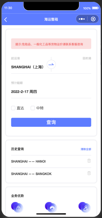目前“ANYCASE”小程序,已实现在线运费查询、现舱查询、在线订舱、在线下单、在线签约、箱讯白条、物流可视化等众多实用、智能的物流服务功能。业务覆盖:海运整箱、海运拼箱、拖车报关、空运、铁路整箱等方面。