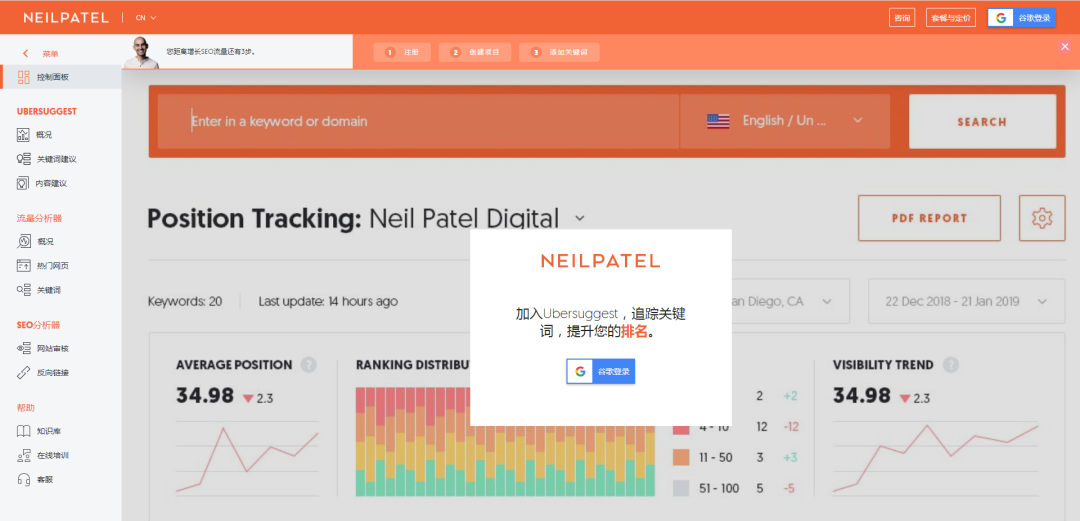 UberSuggest是一款标准的外贸关键字监测工具。我们可以使用它监测同行网站的关键字详情以及流量来源。